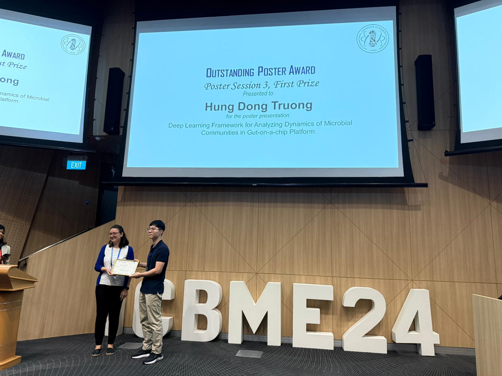 Congratulations to Hung Dong Truong for winning the Oustanding Poster Award for "Deep Learning Framework for Analyzing Dynamics of Microbial Communities in Gut-on-a-chip Platform" at the ICBME 2024 conference! ICBME